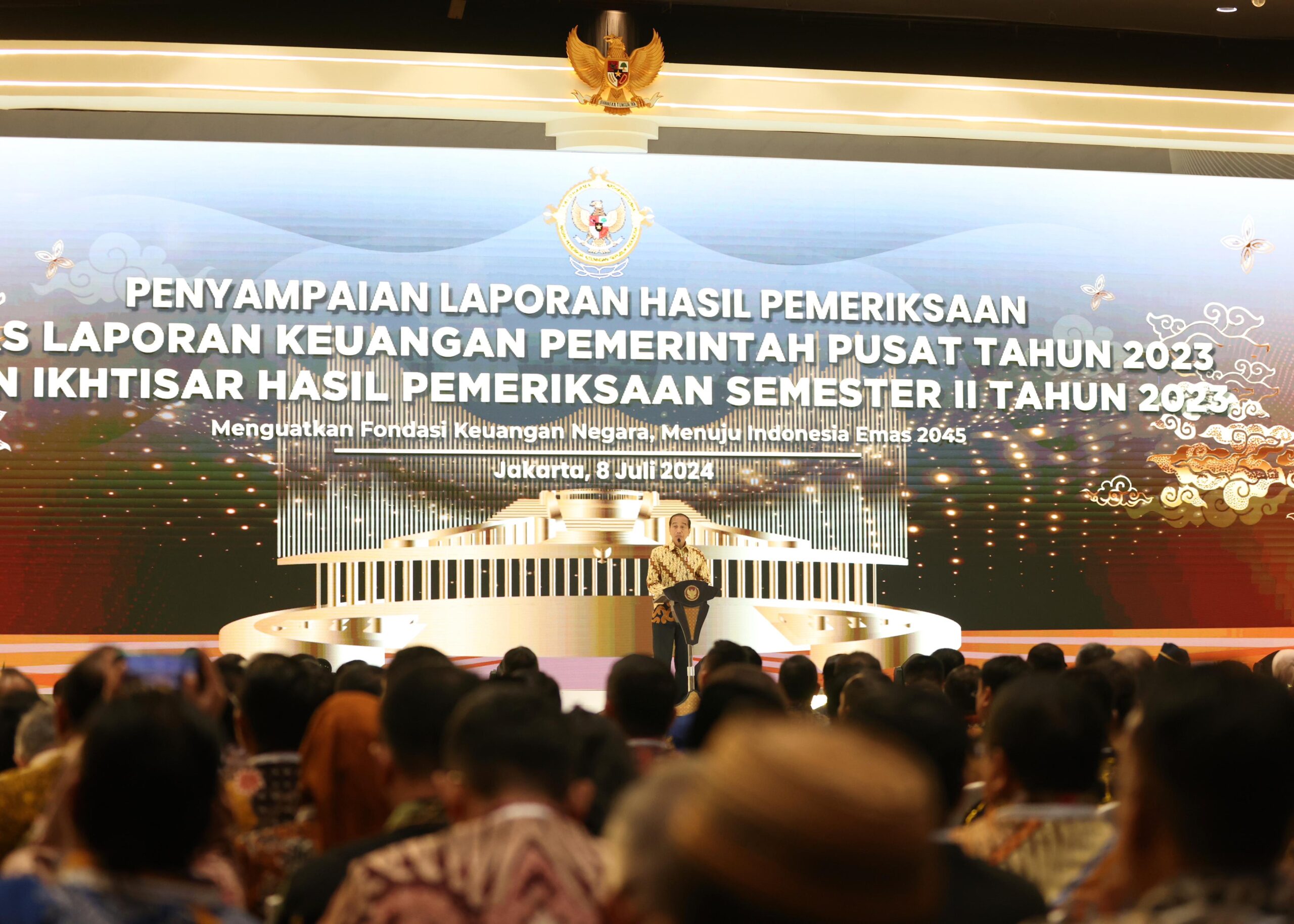 Badan Pemeriksa Keuangan Republik Indonesia (BPK RI) mengusung tema ‘Menguatkan Pondasi Keuangan NegaraMenuju Indonesia Emas 2045’. Penyampaian LHP LKPP dan IHPS II TA 2023 diserahkan langsung oleh Kepala BPK RI Isma Yatun kepada Presiden Jokowi.