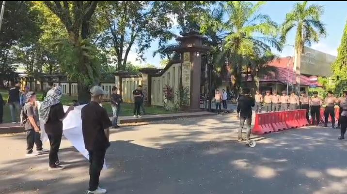 Pantauan di lokasi, Jumat (17/4/2026), massa aksi tampak membentangkan spanduk tuntutan di depan gerbang Mapolda Sulsel. Aksi ini dikawal ketat oleh puluhan personel Sabhara Polda Sulsel.